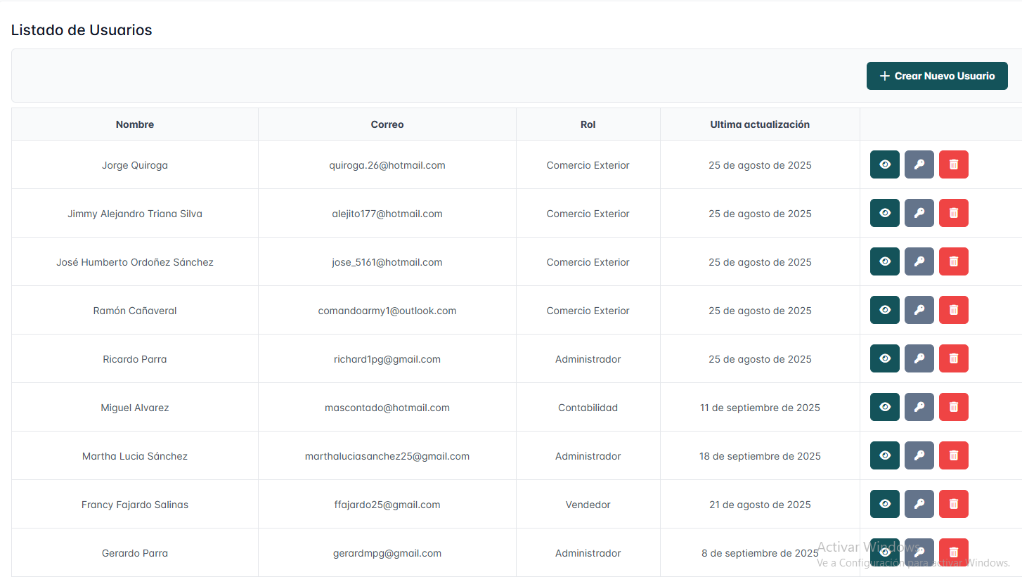 Rol: refleja el perfil asignado al usuario (ejemplo: Comercio Exterior, Administrador, Contabilidad, Vendedor), alineado con las funciones que cumple dentro de la empresa.
